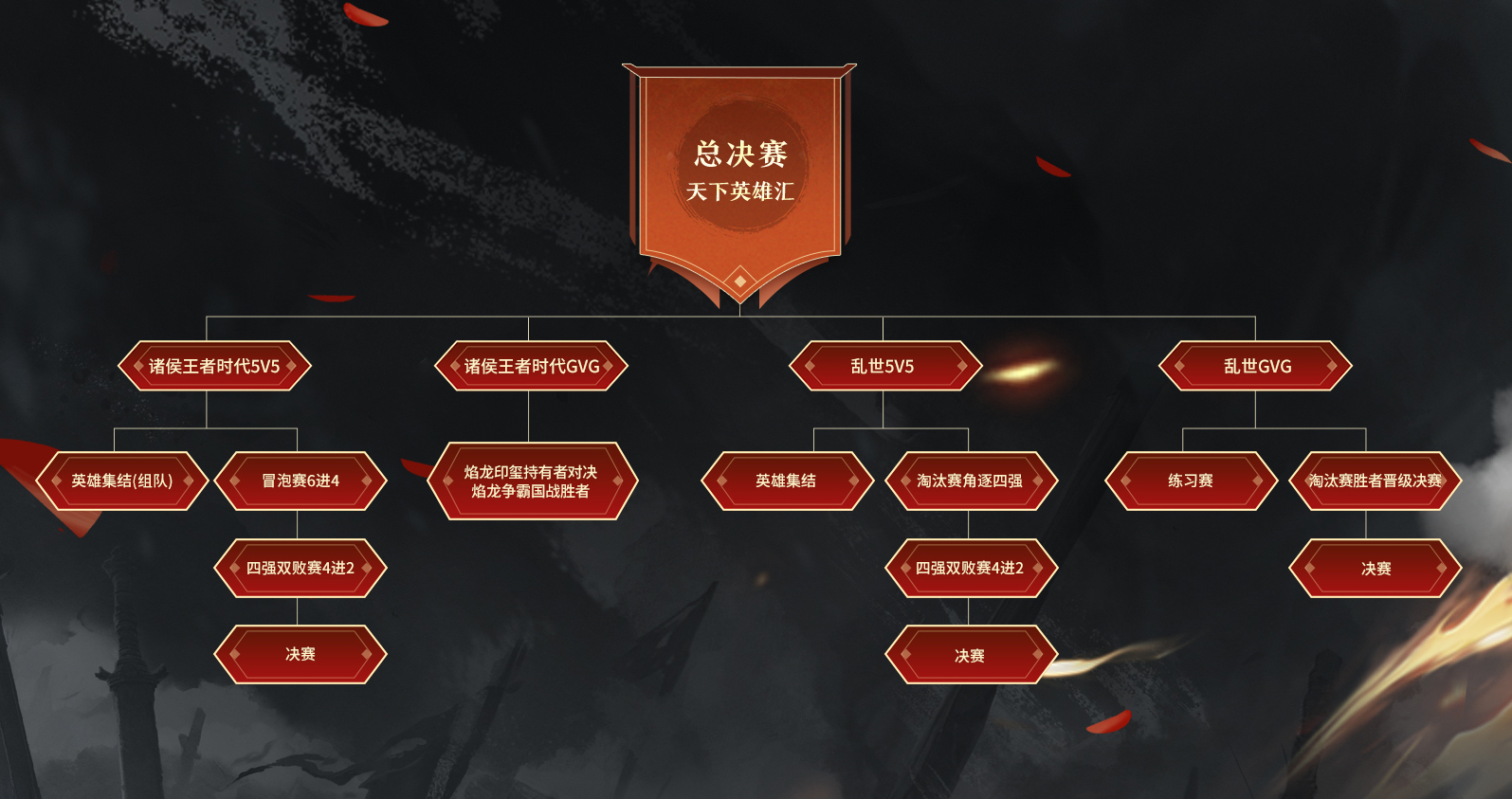 (3)决赛选手安排:由金乌争霸前三周国战结果产生,羽林卫累积胜场最多的两个国家获得参赛资格,羽林卫可参与比赛。若胜场相同,则依次根据禁卫、神武卫胜场和国王战力决定出战资格,国王以第三周为准