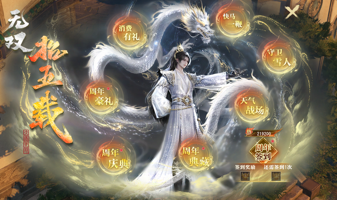 4、双服特色活动,共贺周年!经典服剑试天下跨服战场开启,阴山战场天气模式焕新回归。占领战场神龛更可主动改变天气,打造利于己方的战斗环境。诚邀各位巧用天时,以谋略主宰战局!黄金战斗服物资雪人战场限时开放,雪球大王现身各物资争夺战场,击败雪人宝宝,有概率掉落限定雪人伙伴、银元宝、大经验宝珠、变身雪球等丰厚奖励!