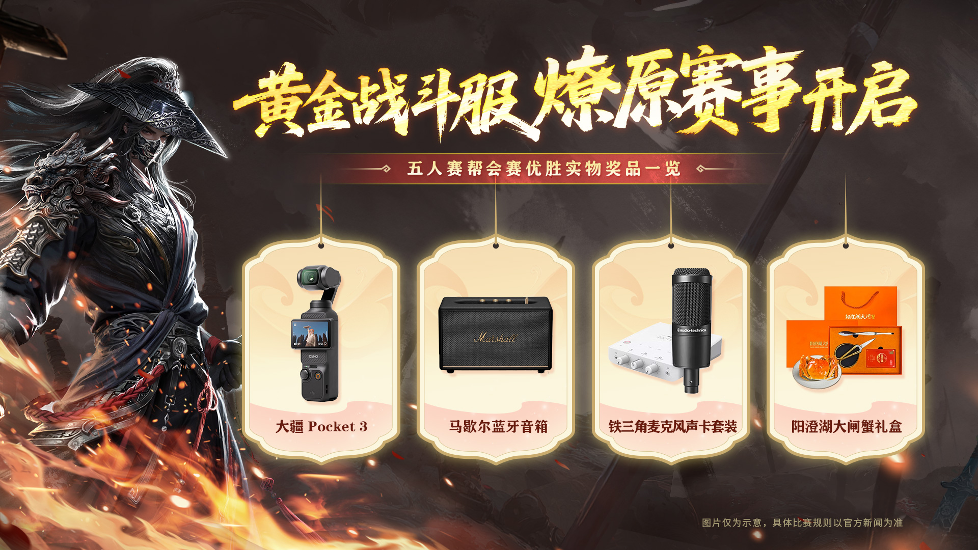 黄金战斗服专属“战火燎原”逐步开启,个人赛、五人赛、帮会联赛多线并进。五人赛与帮会联赛奖励加码,优胜选手可赢取大疆Pocket 3相机、马歇尔顶级蓝牙音箱、铁三角麦克风+声卡套装、网易严选大闸蟹礼盒等总价值4w实物大奖!五人赛报名今日已开启,快来一决高下!